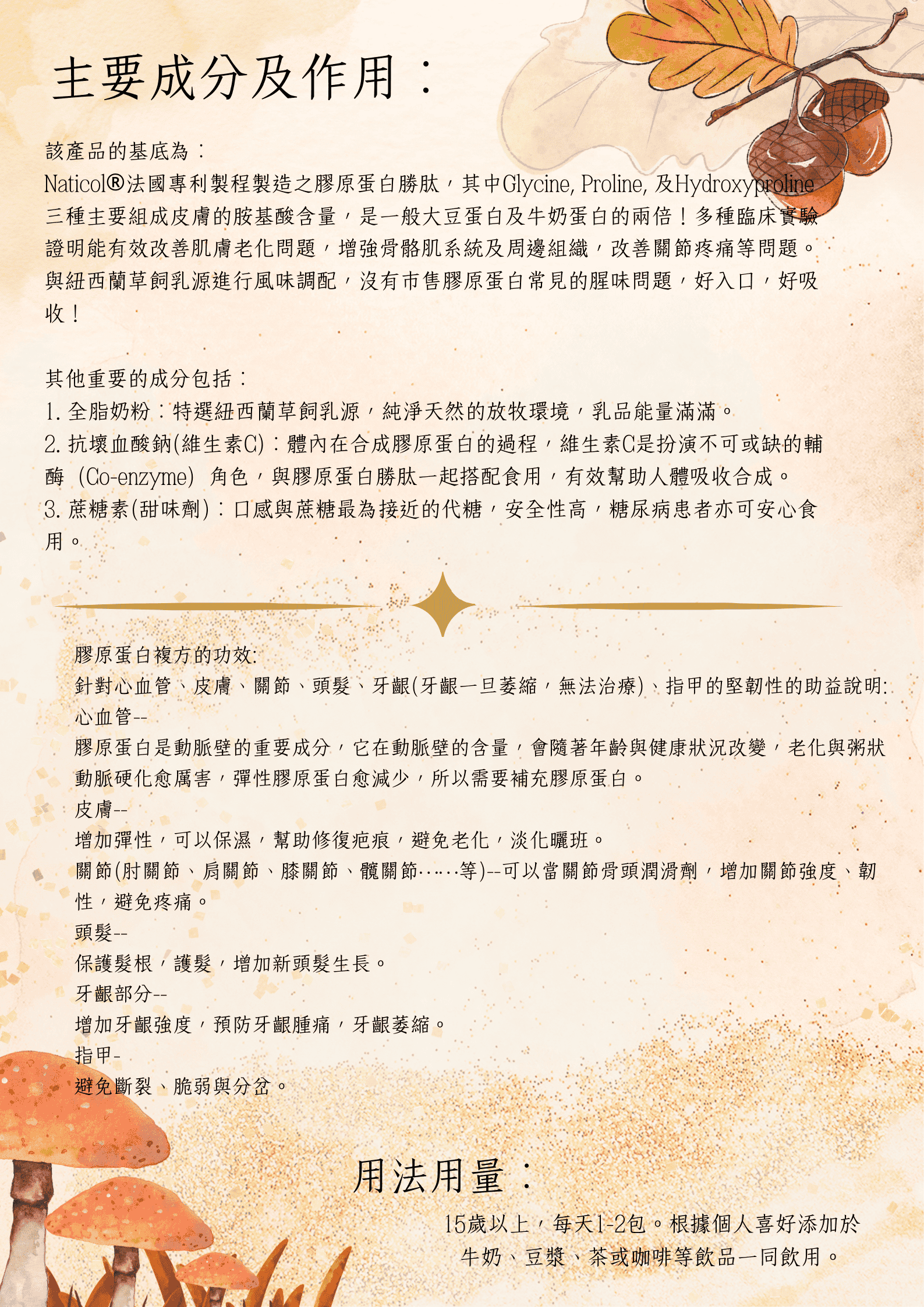 成分:膠原蛋白、全脂奶粉、磷酸鈣、抗壞血酸鈉、香料、蔗糖素(甜味劑)